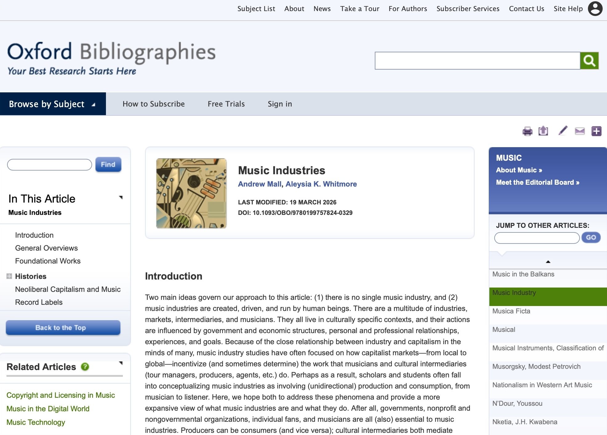 Here, we hope both to address these phenomena and provide a more expansive view of what music industries are and what they do. After all, governments, nonprofit and nongovernmental organizations, individual fans, and musicians are all (also) essential to music industries. Producers can be consumers (and vice versa); cultural intermediaries both mediate production and consumption and are producers and consumers themselves. While we have sought to engage with different types of music industries in diverse contexts, we have also limited the scope and scale of this bibliography. We have focused on peer-reviewed scholarly publications and have thus excluded the plethora of popular media sources, textbooks, instructional texts, periodicals, quantitative data sources, industry reports, and other primary sources that are important to music industry studies. We also have included only English-language works here. Much of the scholarship in this article focuses on popular music contexts in the United Kingdom and the United States. This may be a result of our predetermined limiters (language and peer review). Yet, this also demonstrates a need for more English-language music industry scholarship focusing on other contexts.